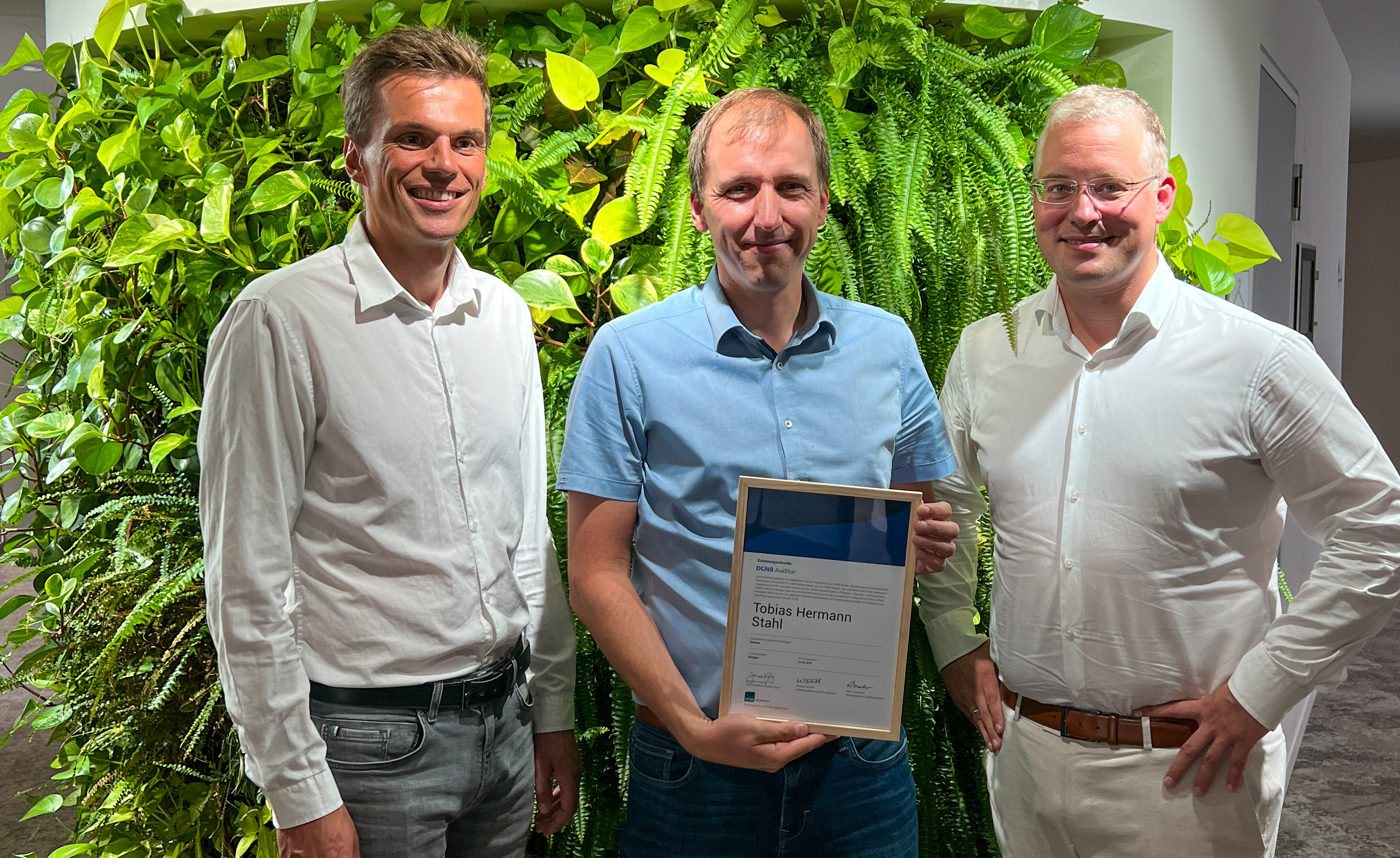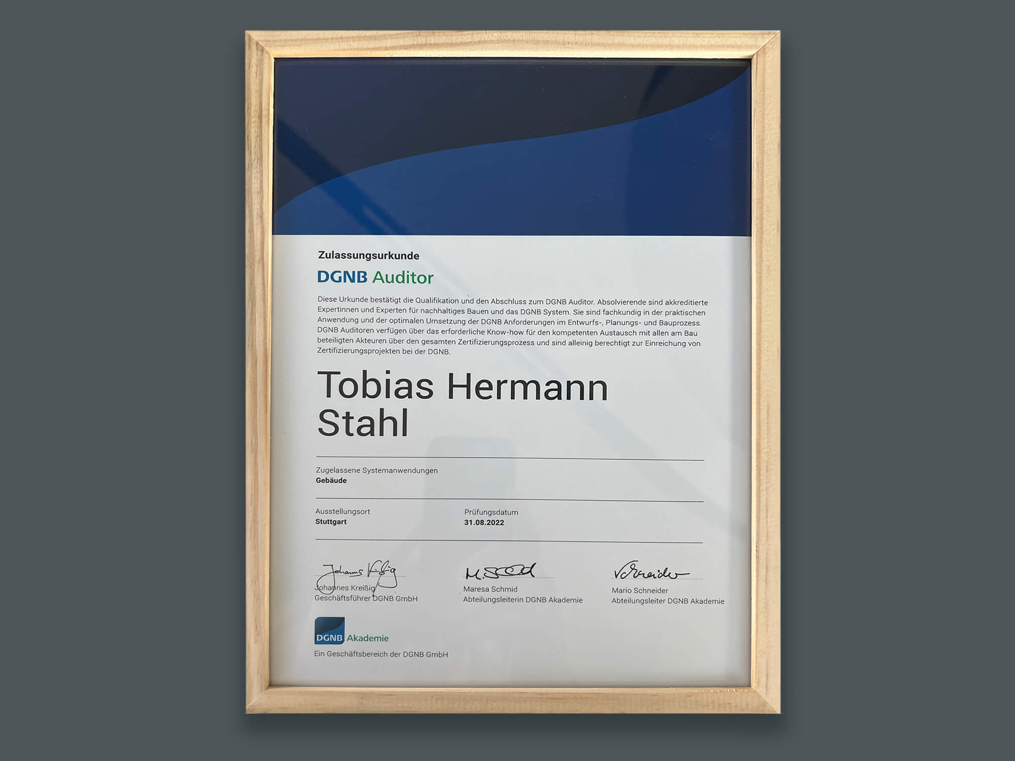 Gestern wurde ich nach einem zweitägigen Intensivkurs, zehn theoretischen und praktischen Seminaren, mehreren Prüfungen und Hausarbeiten zum Auditor ernannt. Die letzte Veranstaltung fand in der Zentrale der DGNB in Stuttgart statt. So hatte man die Möglichkeit auch die handelnden Personen besser kennenzulernen, im „Living Showroom“ der DGNB viele interessante Materialien und Ideen für Bürogebäude anzuschauen und von einem sehr erfahrenen Senior Auditor, der bereits mehr als 50 Projekte auditiert hat, sehr viel zu lernen.